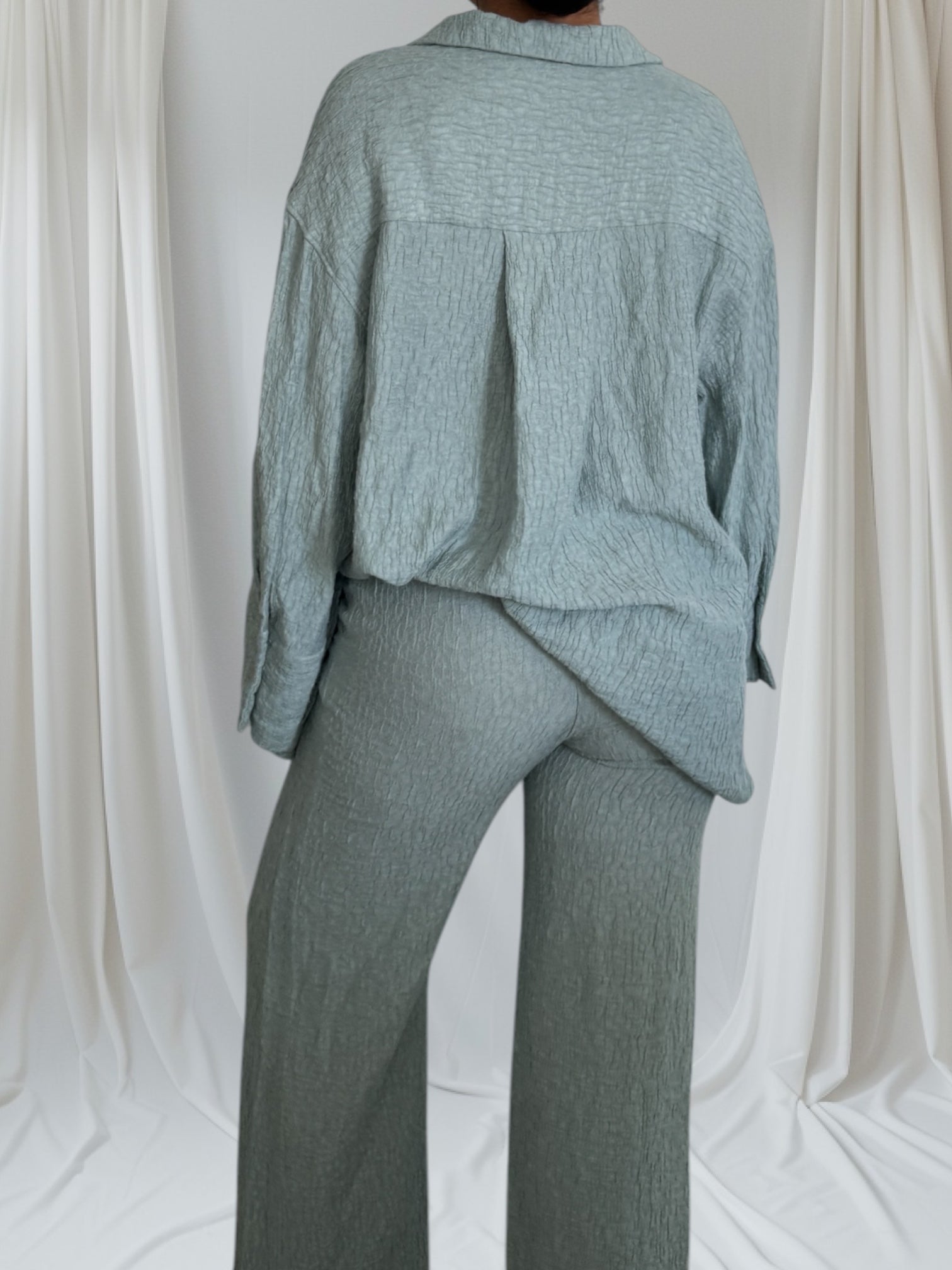Este conjunto de algodón fresco es perfecto para climas cálidos o templados. La camisa de talla XS tiene una horma anchita, y el pantalón talla 34 se encuentra en excelente estado.